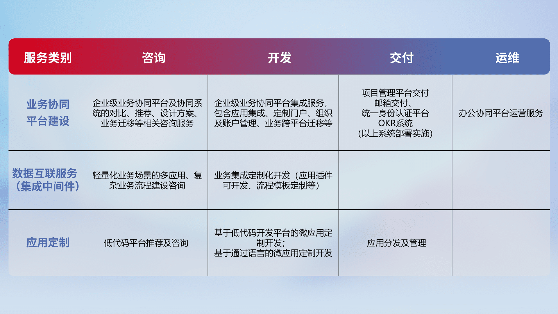 针对钉钉、、企微、、、IDaas等平台级产品提供产品的规划、、方案、、、、交付、、、、定制化开发等服务,,实现如统一协同办公、、智能客户服务、、、、混合会议管理、、、智能数据查询、、等业务场景,,,实现数字化转型。。。